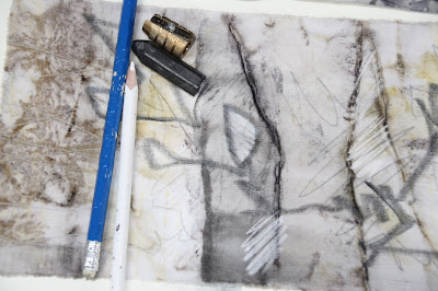 It was at this point that I fell in love with the pencil and white crayon on the fabric. It is eco printed white sheeting and is a beautiful surface to draw into.